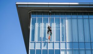 Dış cephe cam temizliği, profesyonel ekipman, vinç veya asma iskele sistemleriyle uzman personel tarafından güvenli şekilde yapılır.